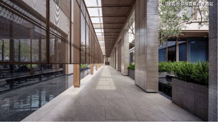 归家路上漫步于水榭光廊,阳光透过格栅在地上形成斑驳的光影,与单侧的水景波动的涟漪互动,让人在潜移默化中,获得身心的舒缓。