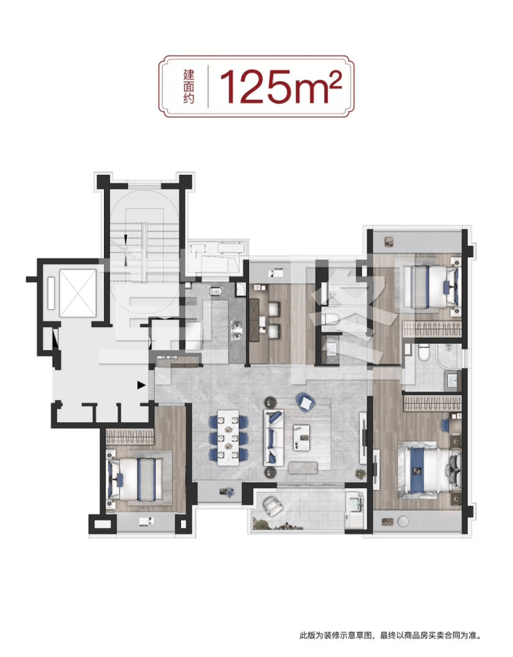 约125㎡4房2卫户型是约99㎡的升级版,四房更能保障业主的全生命周期需求。