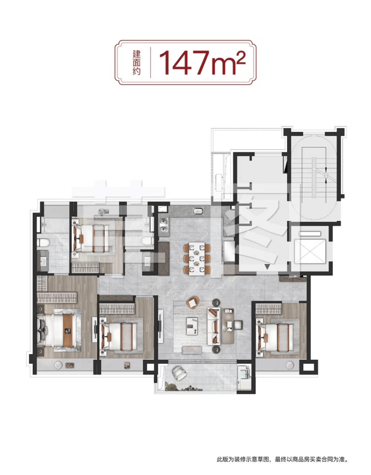 约147㎡4房2卫户型类一梯一户的居住体验,业主能独享一整个电梯厅,私密性相当高。
