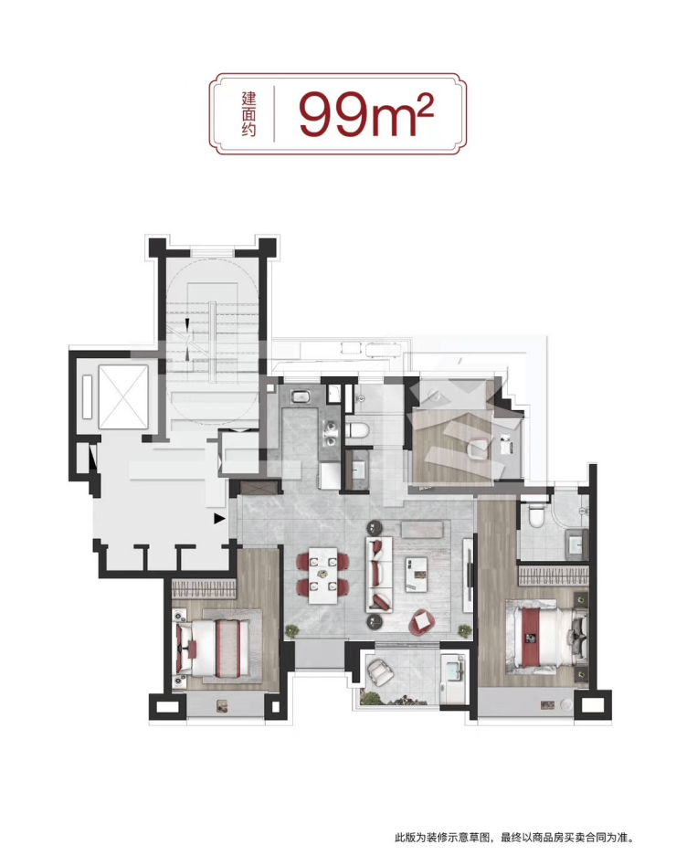 约99㎡3房2卫户型是上海市场中最主流的面积段之一,但印象青城的户型设计却超脱以往。