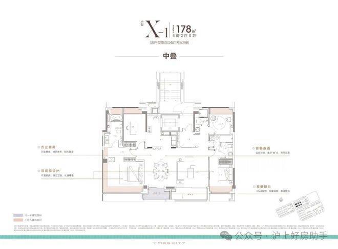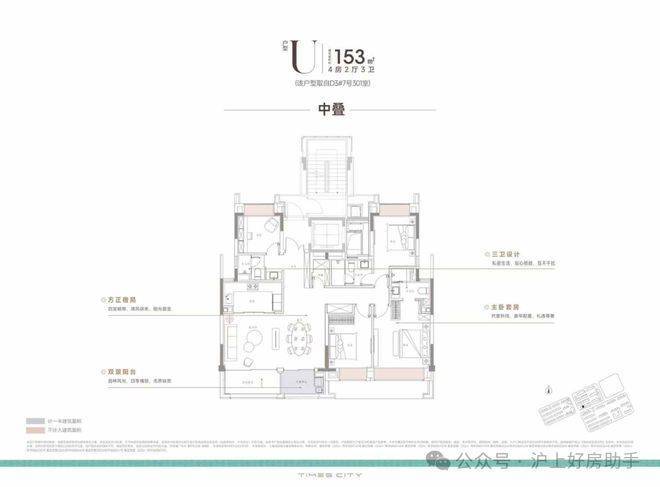中平户型以四开间朝南的IMAX级采光面,打造出堪比市区豪宅的尺度感。4房4飘窗2阳台的设计,配合双套房布局,一共有三个套房,让每个家庭成员都享有独立私密空间。